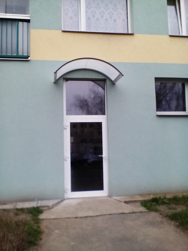 Požadavkem SVJ bylo zastřešení vstupu, přičemž důraz byl kladen na ekonomické řešení. Vzhledem k těmto požadavkům jsme navrhli řešení v podobě typizované stříšky ve standardní výrobní velikosti bez nutnosti kotvení sloupků.