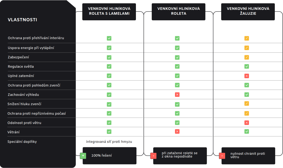 Venkovní rolety a žaluzie chrání před přehříváním v letních měsících, únikům tepla v zimním období, šetří energii, snižují hluk a dodávají fasádě moderní jednotný vzhled.
